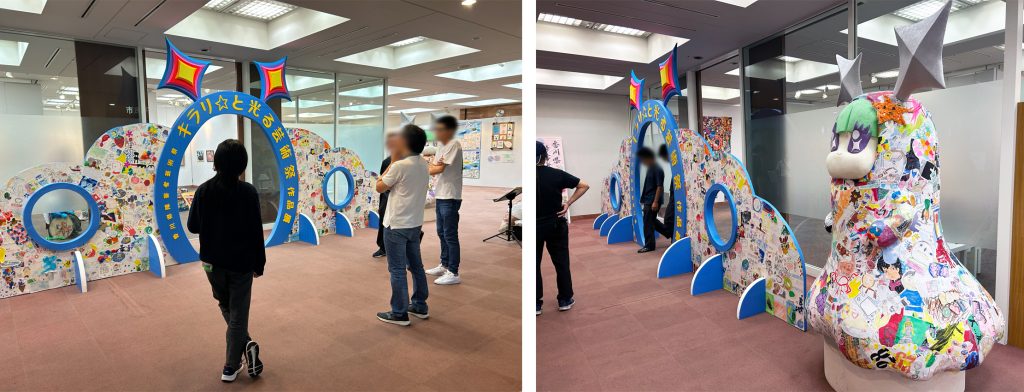 会場入口には、英明高等学校と特別支援学校がコラボして作った看板を兼ねた巨大な入場ゲート、そして、前回の作品展で作られた完成度の高い大きなオブジェ「キラリちゃん」が運ばれて来ました。どちらも表面に障害者の方が紙に描いた絵や文字が埋め尽くされています。殺風景な会場入口が一気に華やかになりました!すごい!