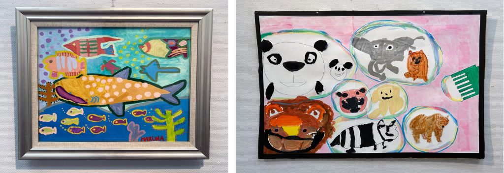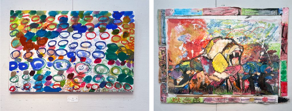 左の作品のタイトルは「くるま」。タイヤがいっぱい!? 右側の作品は、今回出品された中で最大。切り貼りされています。ライオンを描いたド迫力の大作です。