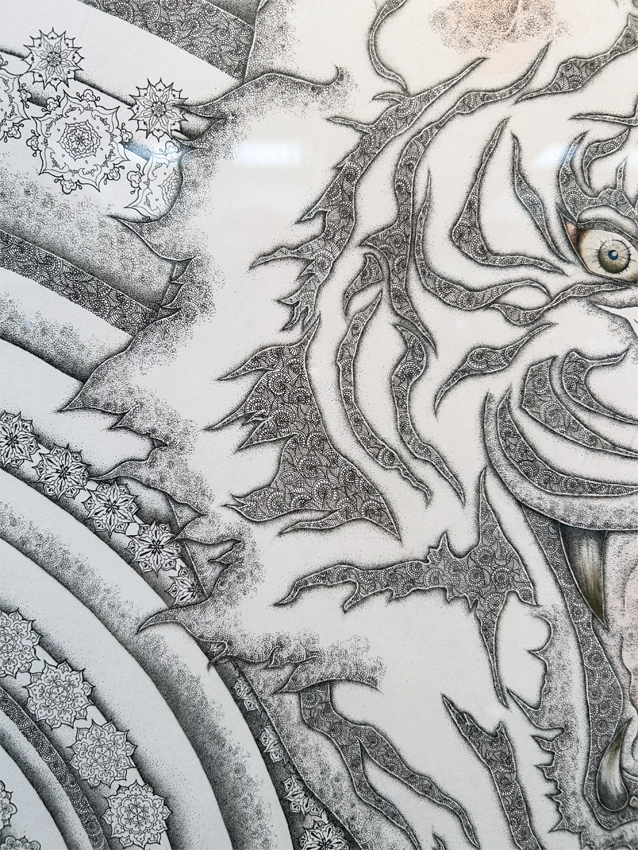 もっとも注目を集め、多くの鑑賞者が集まりざわめいていたのが、上の写真右側のトラを描いた作品です。