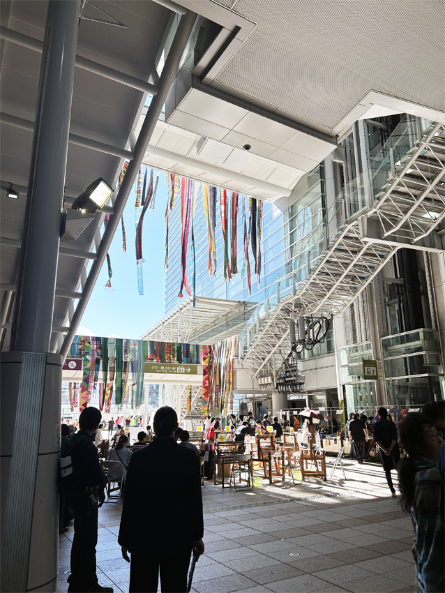当日は、気持ちのいい快晴の朝を迎え、2階・3階から障害者施設で作られた100本以上?の長い「さをり織り」織物が風に揺られています!大勢の方々が行き交っていました。1階デックスガレリアのエリアにはステージも設けられ、11時からの開会式では、香川県知事からのご挨拶もあり、演奏会、ダンス、ファッションショー等が行われました。その他、はた織り機が十数台並べられての「さをり織り」体験、自由に色を塗ってオリジナルなバッグを作るワークショップ等で皆さん楽しまれていました。