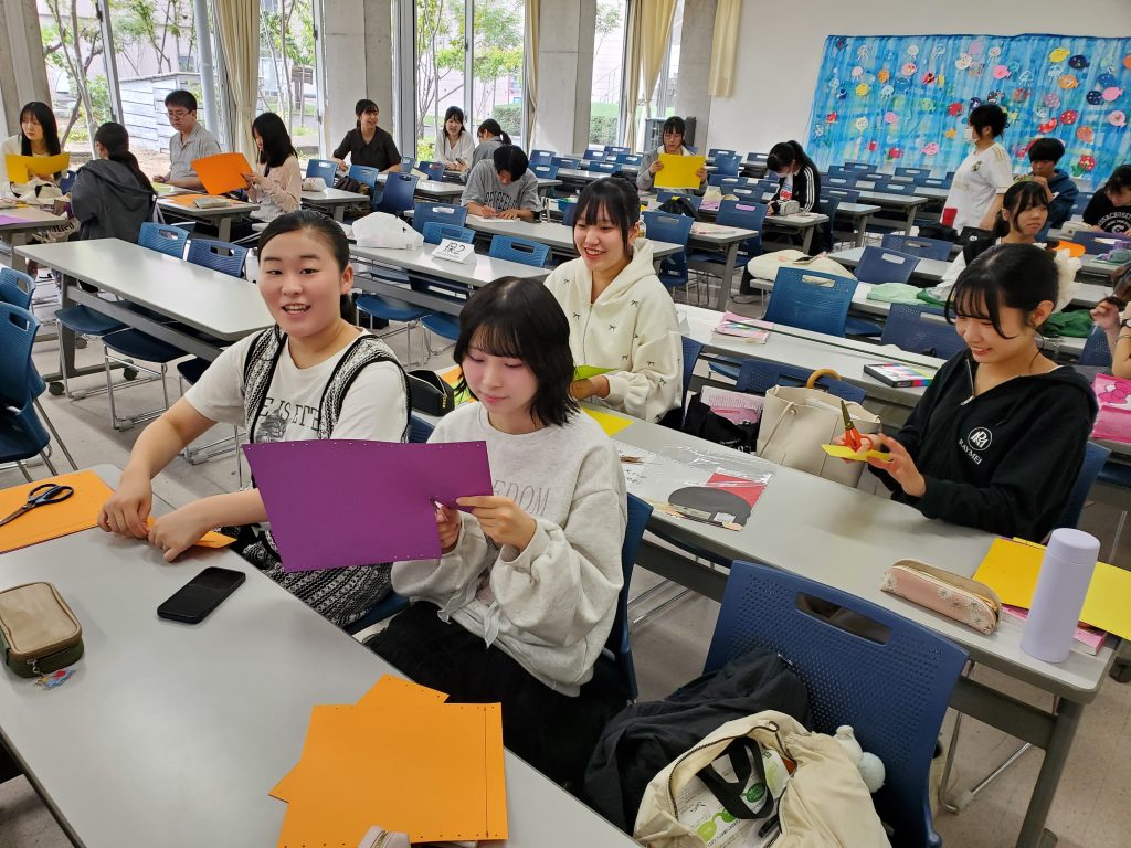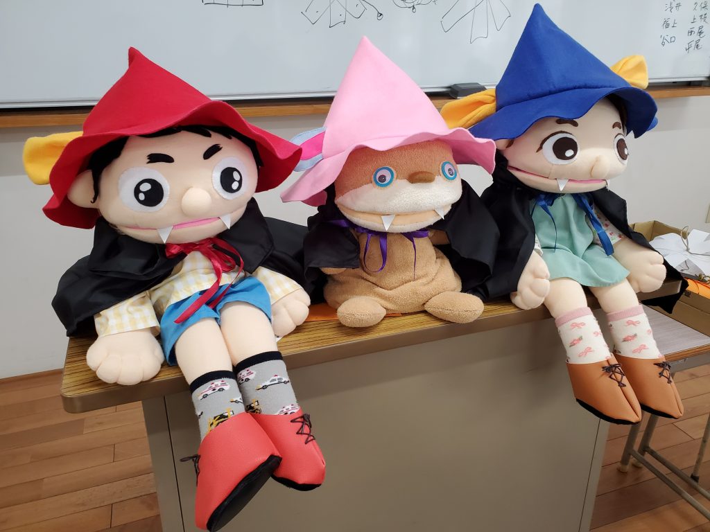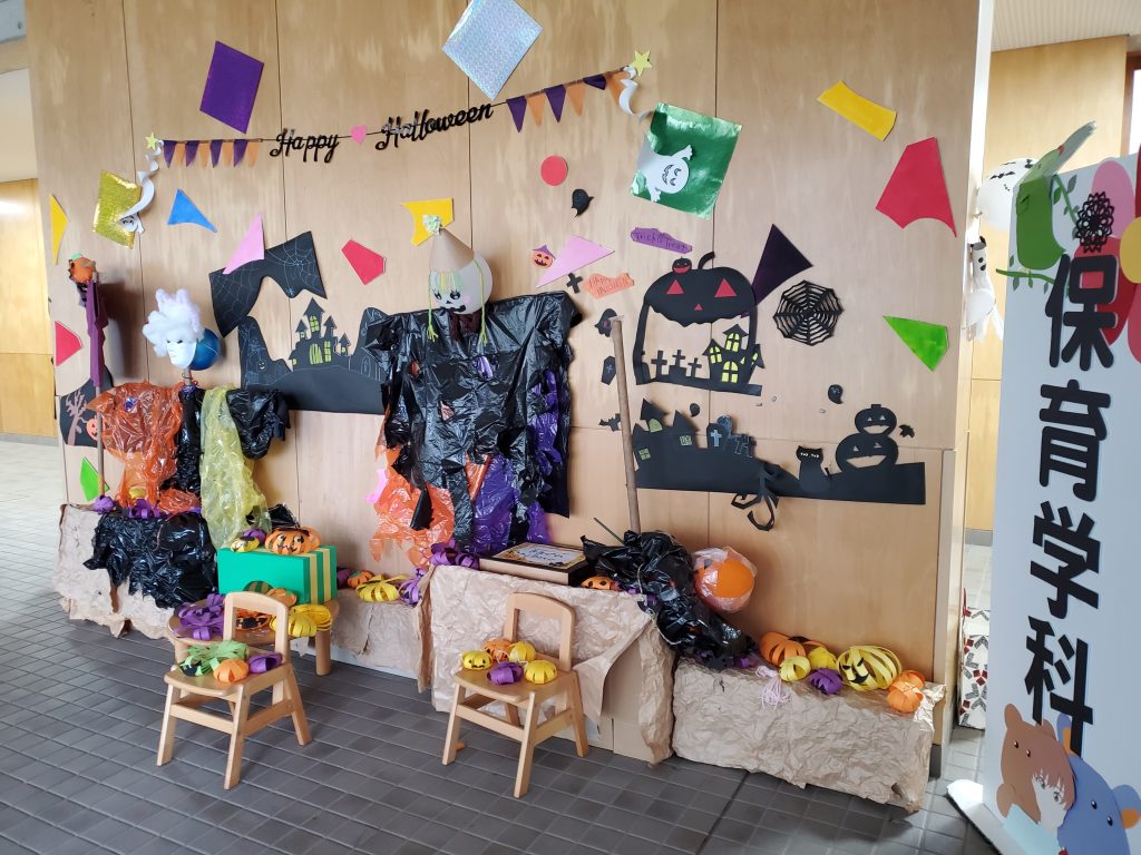 保育学科では、将来保育の現場で子どもたちと一緒に季節の行事を楽しむために、年間にいろいろ季節の壁面製作や活動に取り組んでいます。今年は学校全体でハロウィンを楽しもう!ということで、保育学科も2号館1階ロビーを飾りつけてみました。