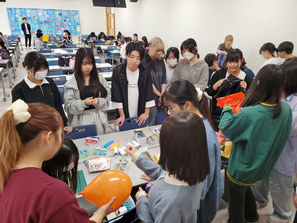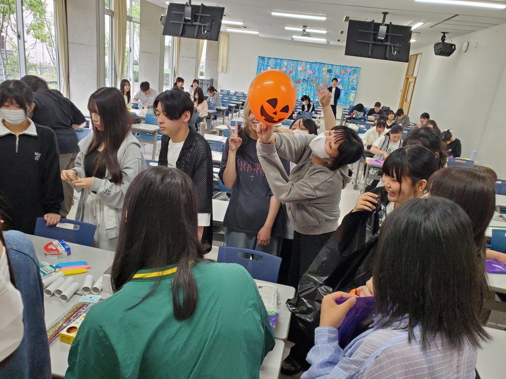 次に、ハロウィンのかかし!風船の頭にいろいろ着せて…作りながら笑いが絶えない学生さんたち🤣