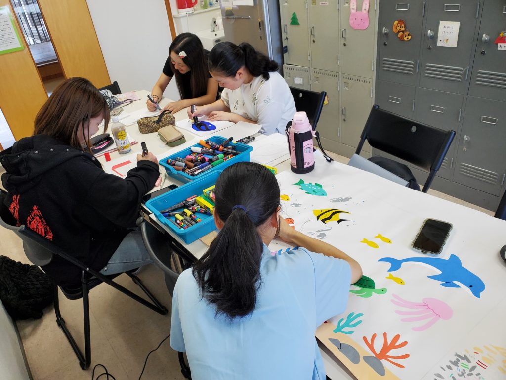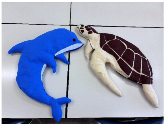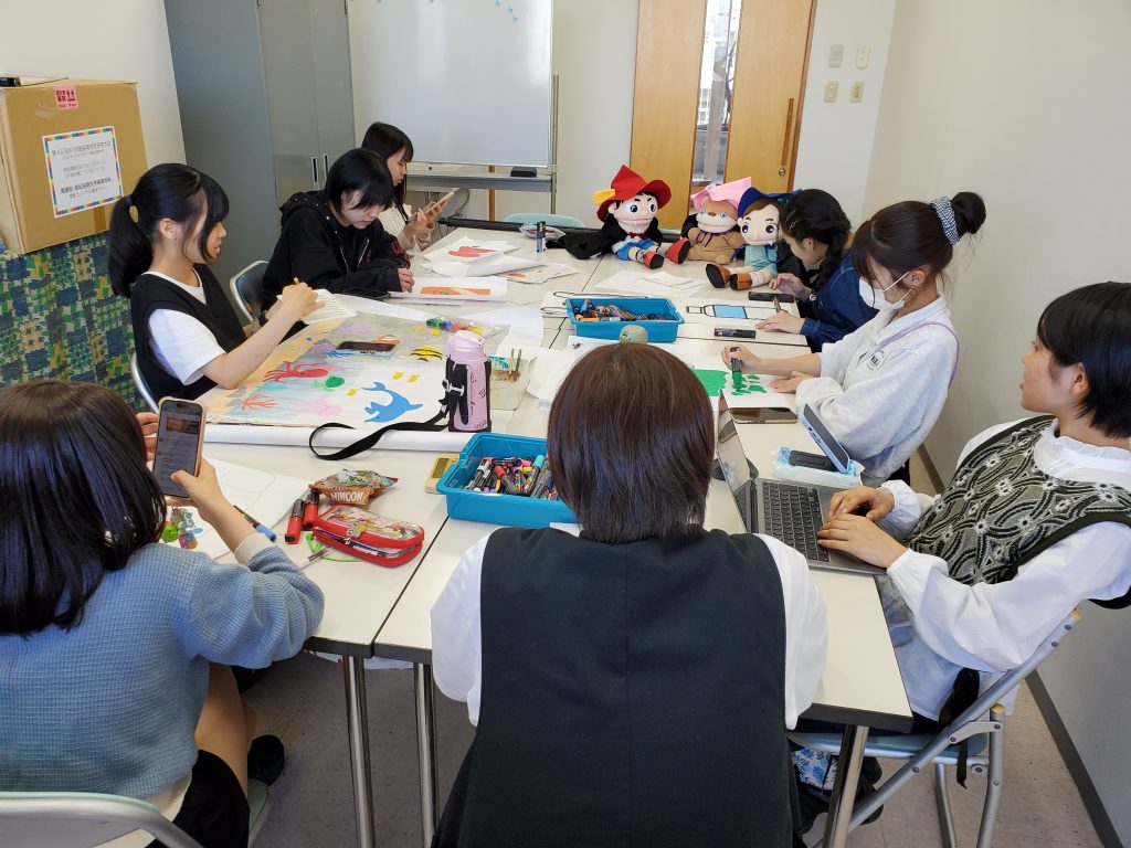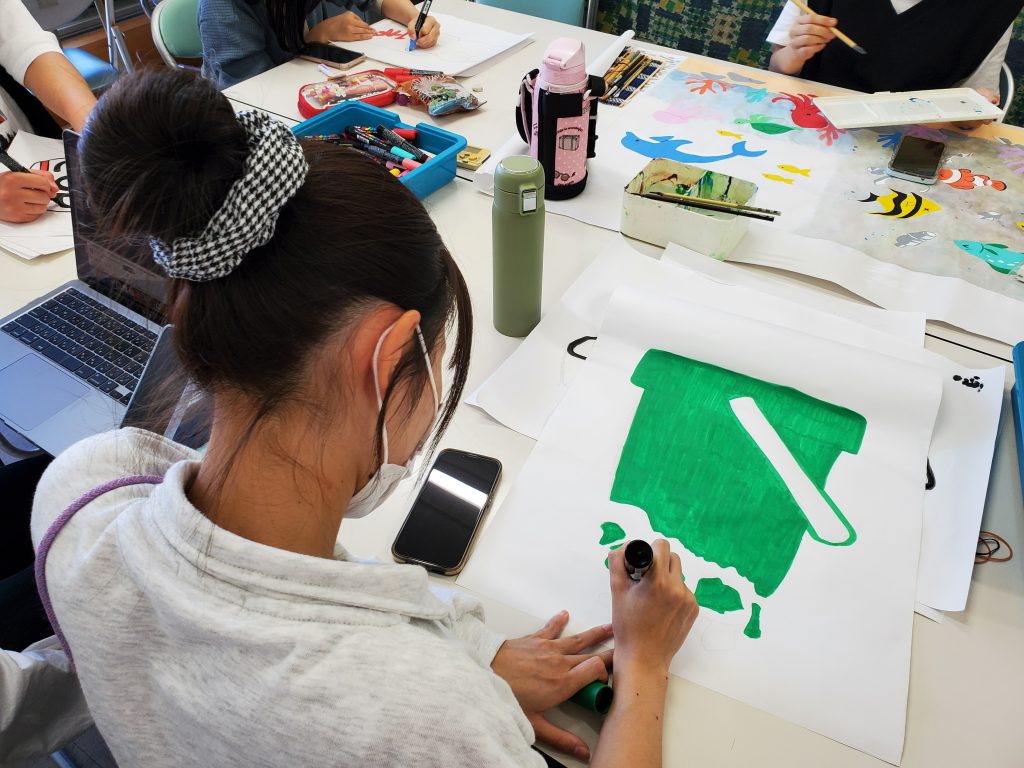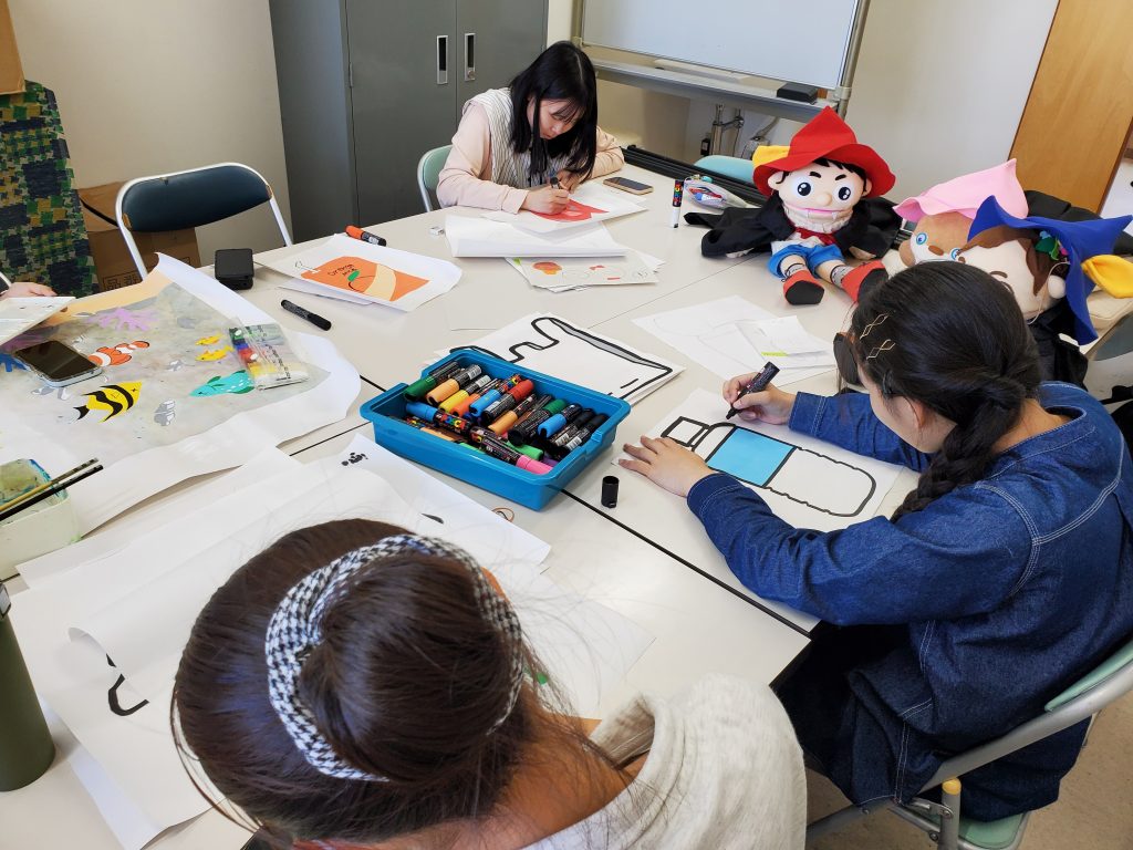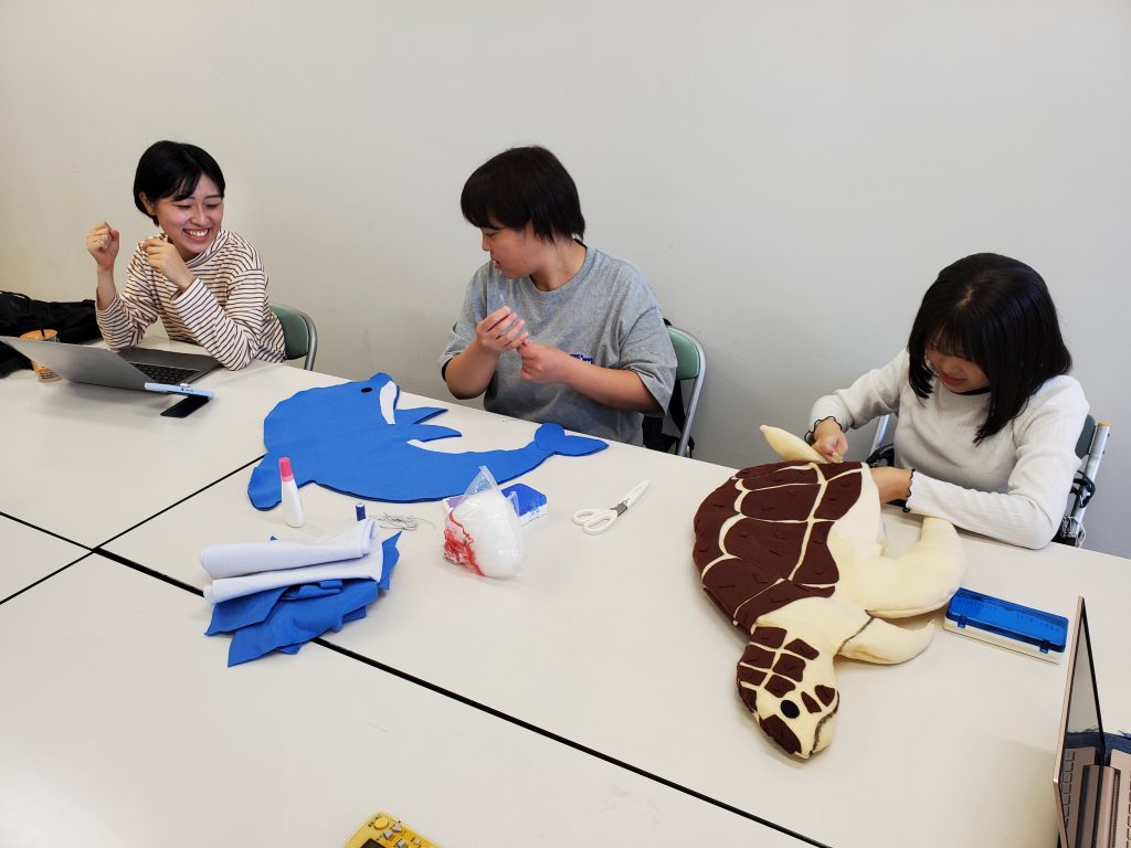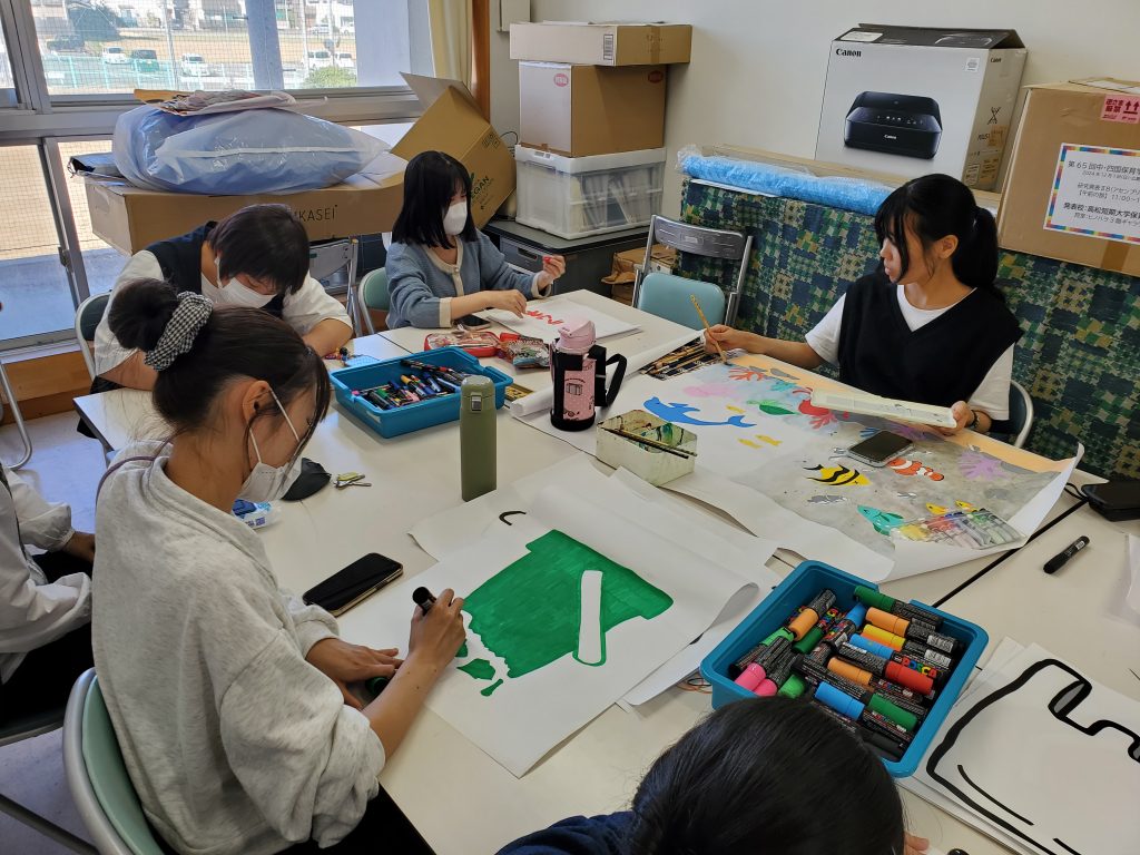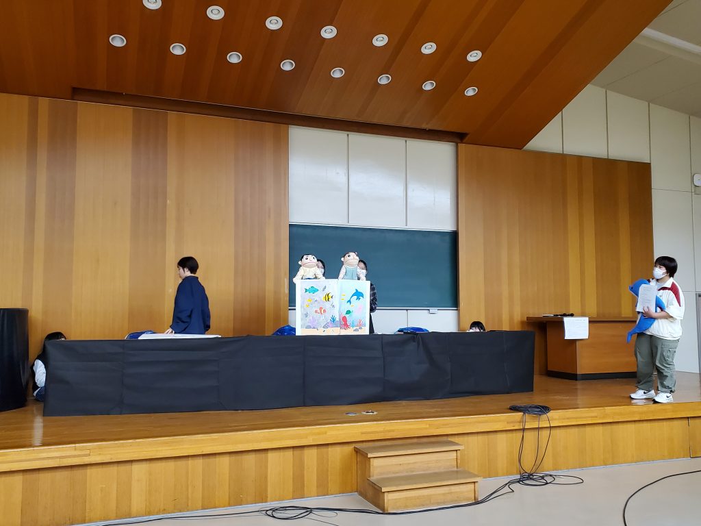 毎週水曜日の探究活動の日にみんなで集まり、小道具を製作しました。主人公のほーちゃんといっくんは昨年度からの続投で(こうくんは応援団)、ウミガメやイルカの人形は新しく製作しました。また、海ごみや海の生き物のイラストを大量に…これが大変でした💦それから、今回のお話で重要な役割を果たす絵本も完成することができました😄