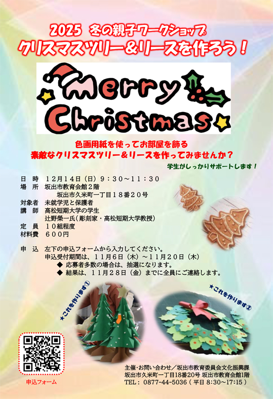 美術研究室では、毎年12月に恒例となっている「冬の親子ワークショップ」を12月14日㊐に坂出市教育会館で開催します!主催者である坂出市文化振興課の職員方が、今年も素敵なチラシを作ってくれました!