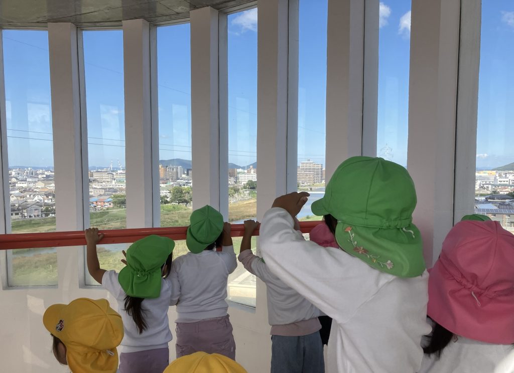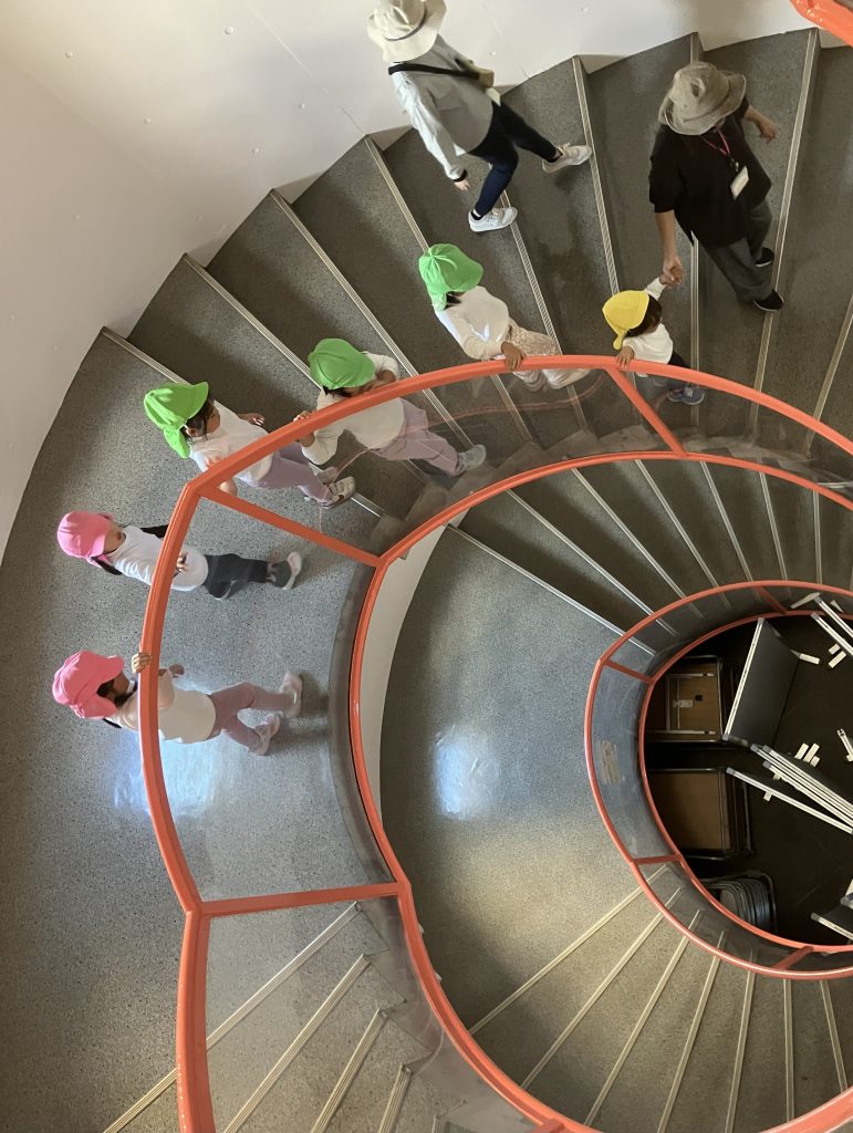 そのあとは、大学探検!!本館のらせん階段の一番上は、春日から木太の町が見渡せます!6階から1階までのらせん階段も、わくわくした表情で降りてきました。そのあとは本館1階の玄関ホールで遊びの紹介画を見たり、壁面の彫刻をみんなで押したり?と、見るもの触るものを楽しんでいました。また、ビオトープや桜並木でも自然に触れて、いい表情が見られていました。