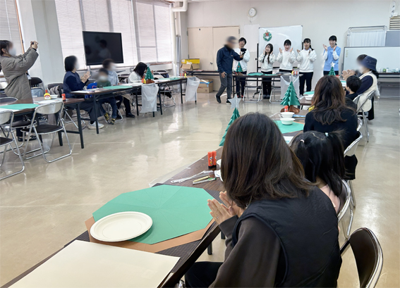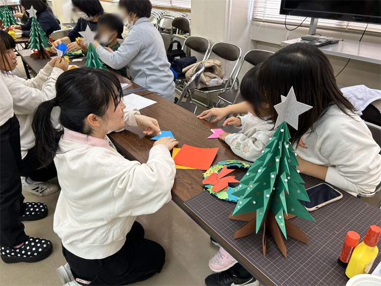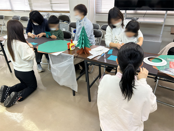 このワークショップは、美術研究室2年生5人が講師となって、未就学児を対象に、保護者の方にも手助けをしてもらいながら、一緒に楽しく、力を合わせて作り上げていく造形教室です。色画用紙や色紙等を使ってクリスマスツリーとリースを作ります。