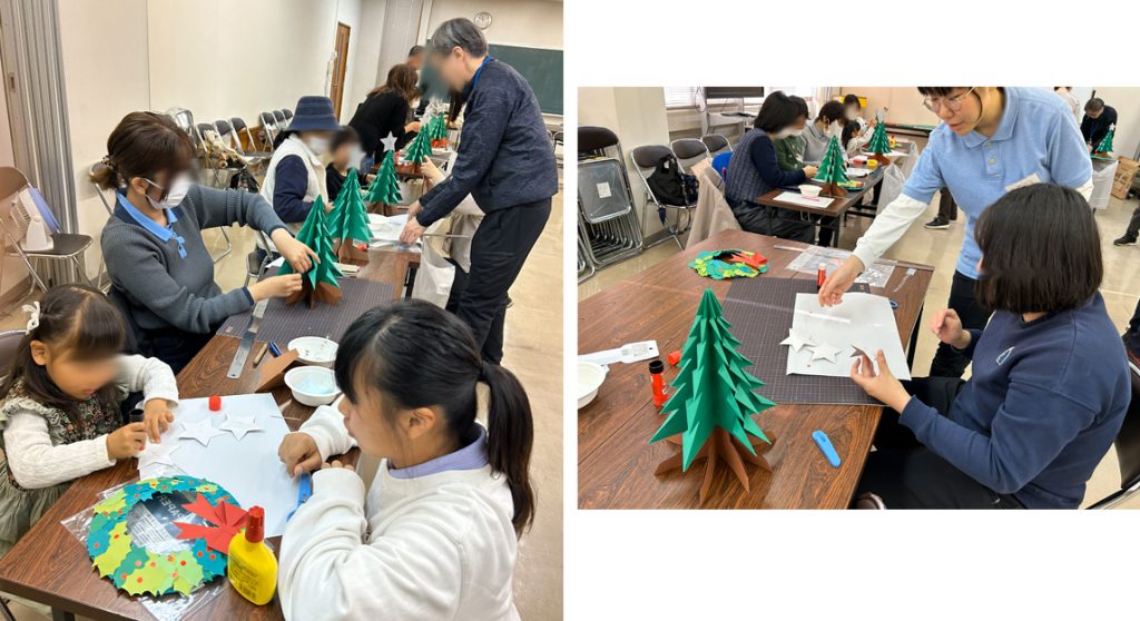 子どもたちがリースの葉っぱを貼ったりリボンを付けたりしている間に、保護者の方にはクリスマスツリーの作業に移ってもらいました。