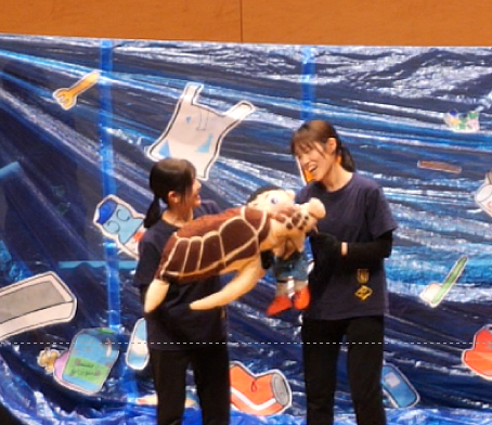 そこで出会ったのがウミガメさんとイルカさん、どちらもビニール袋が頭に被さって取れなくなったり、網に引っかかって身動きが取れなくなってしまって困っていました。ほーちゃんといっくんはウミガメさんやイルカさんと心を通わせながら、なんとか二人を助けます。そして、海ごみで暗く汚れてしまった海の現状を教えてもらい、ショックを受けつつも、自分たちの海をきれいにすることを約束して、みんなともだちになりました。