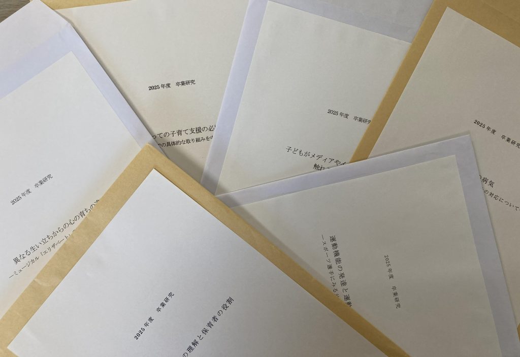 キャンパスライフ 2025年度 卒業研究の成果を提出しました! 2026.01.07 by tthoiku 0 卒業研究は、保育学科での2年間の学びを総まとめする卒業必修科目です。 12月19日の提出期限までに、2年生全員の提出が完了しました。 まずは、前期の「保育学研究法」の授業の中で、各自が取り組みたいテーマを決めて、骨子の組み立てや資料集めから始めました。後期に入り、研究室の先生のアドバイスを受けながら、卒業研究の授業として少しずつまとめていきました。 2月9日には「卒業研究発表会」で、1年間の研究の成果を発表します!