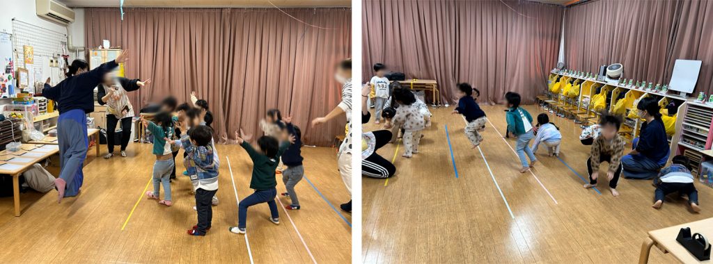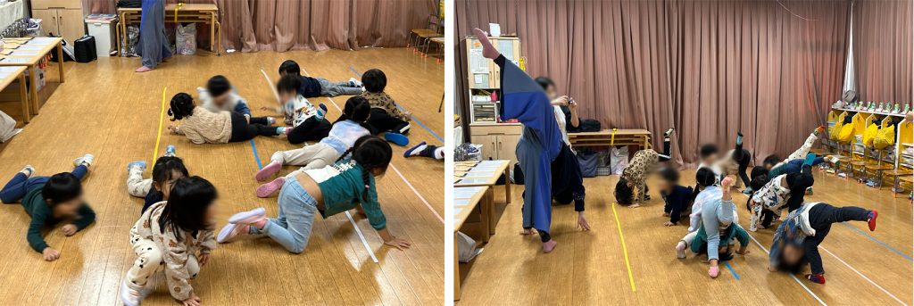 カエルになってみよう、波になってみようといろいろな動きに誘導して、身体をほぐし、徐々に温まって来ましたね。