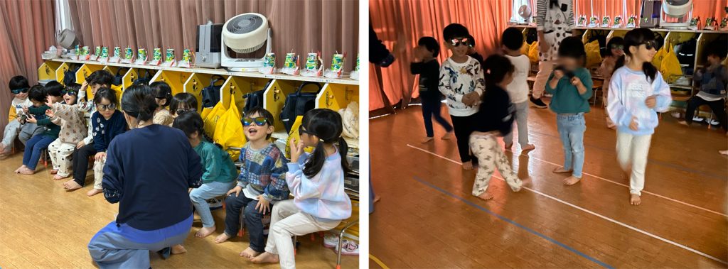 最後は、自由に子どもたちがやりたいことをやって楽しみました。再びヘッドライトを付ける子、身体を動かす子、パネルライトに夢中になっている子。