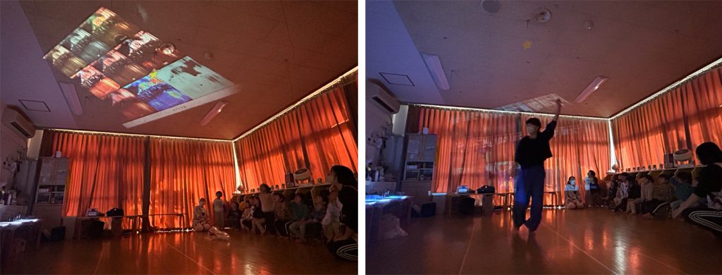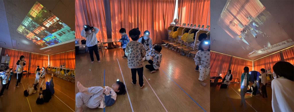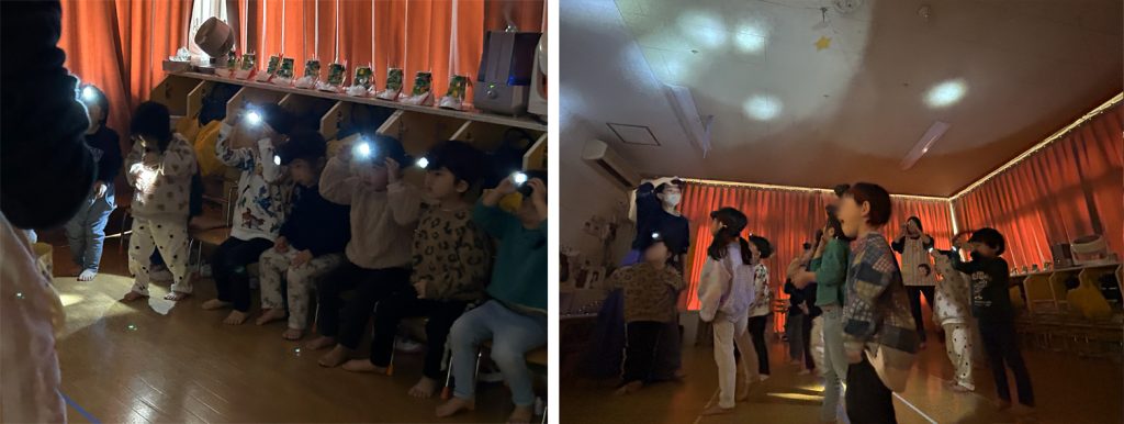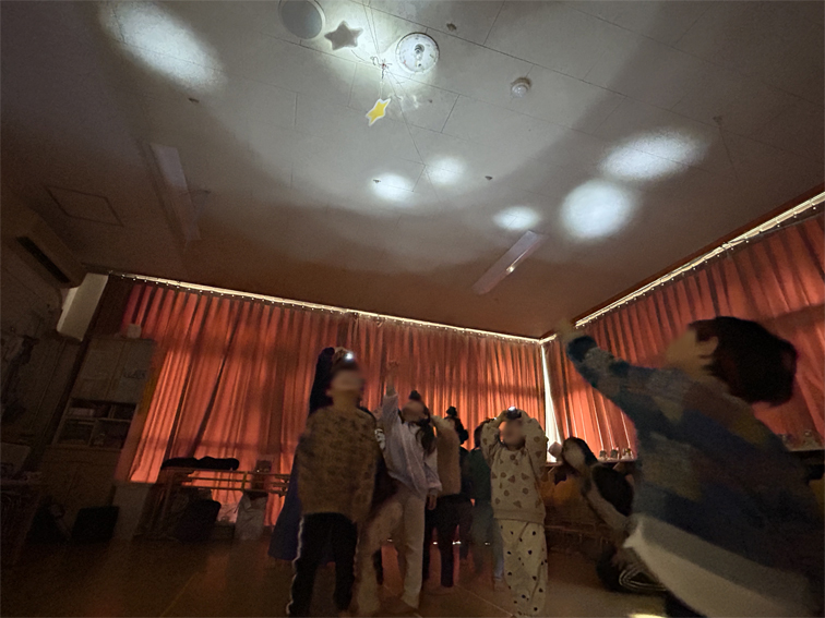 でも、それだけでは終わりません!子どもたちがヘッドライトを頭から取ったところで、次はみんながいる部屋の様子が天井に投影されました!