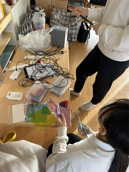 「こっちのパネルライトの所に集まって!」の掛け声で。学生が作程いろいろな形に切ったカラフルな透明フィルムを使って自由に遊ばせます。光を通した色、形、重なり合いに、「わあ~きれい!」「これ、見て見て!」と大喜び。