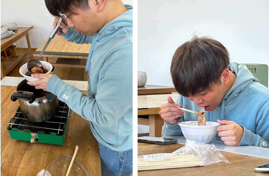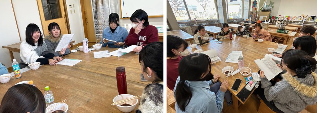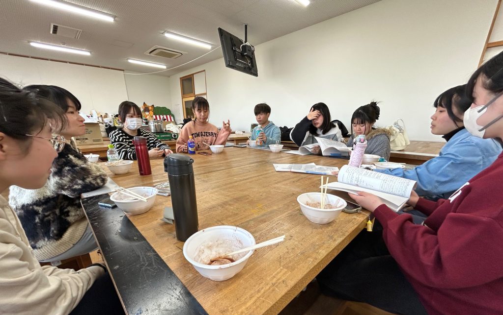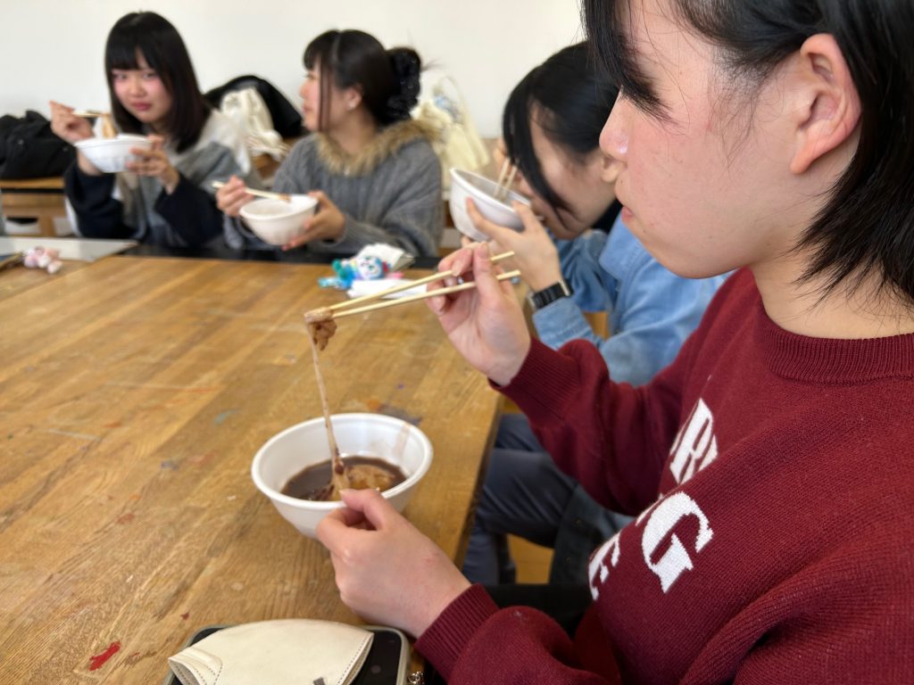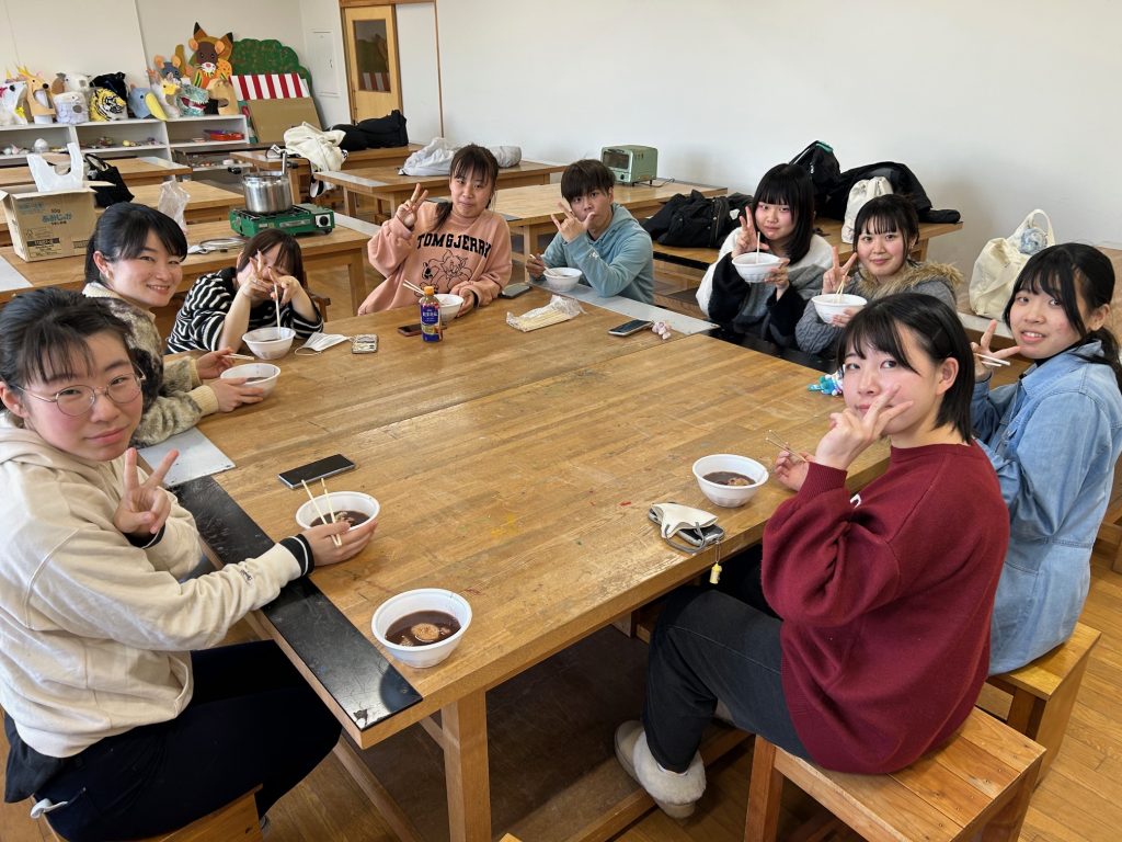 こんにちは。保育学科・美術研究室の辻野です。明後日(21日)から1年生は、いよいよ保育実習が始まります。そこで今日は、ぜんざいを食べながら、研究室先輩の2年生から1年生に向けて「がんばれ~!」とエールを送る壮行会を開きました!