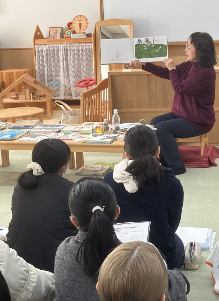保育内容「環境」の授業では、「子どもたちの環境として大きな意味をもつ絵本をどのように保育に取り入れていくか」の実際として、読み聞かせグループ『おはなし紡ぎの会』の方におはなし会をしていただいています。