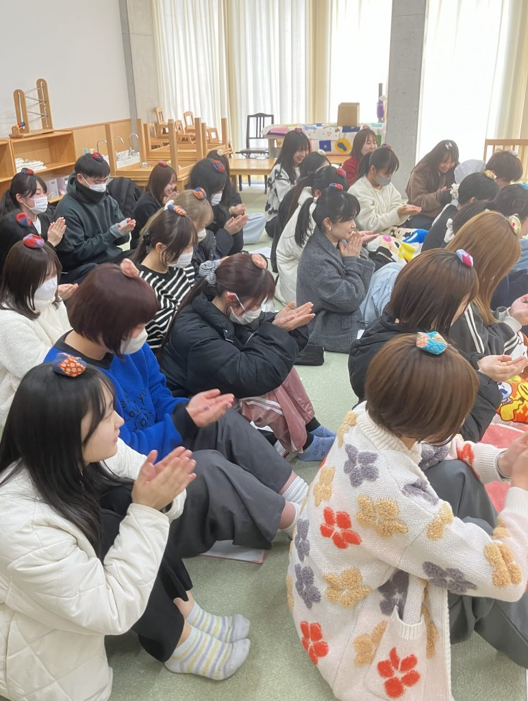 子どもたちに大人気の絵本「おせち」や、松ぼっくりがペットボトルに入って出てこなくなる「びっくり松ぼっくり」などの読み聞かせ、わらべ歌を使ったお手玉遊びなど、学生の皆さんもお話会を存分に楽しんだようでした。
