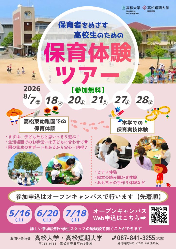 !追伸! 3/20(金・祝日)のオープンキャンパスでは、2026年8月実施予定の「保育者をめざす高校生のための保育体験ツアー」についての案内もする予定です。役立つ情報盛りだくさん!ぜひお越しください、待ってまーす🤗