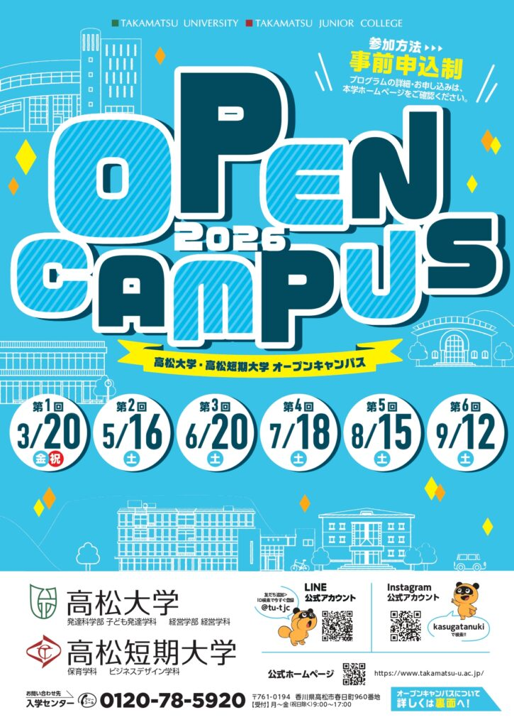 3/20(金・祝日)オープンキャンパスの事前申込はこちらからどうぞ!https://opencampus.takamatsu-u.ac.jp