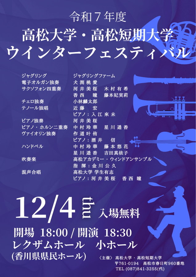 高松大学・高松短期大学ウインターフェスティバルを、下記のとおり開催します。高松アカデミー・ウインドアンサンブルやジャグリングファームなどのクラブ・サークルや学内オーディションを通過した学生が、日頃の成果を発表する音楽の祭典です。