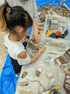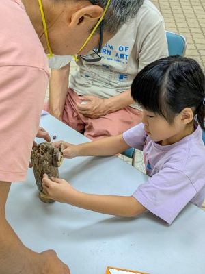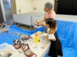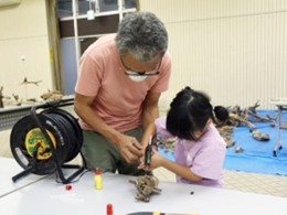 高松短期大学保育学科の「流木造形・親子ワークショップ」は、海岸に流れついた流木を用いて生き物をテーマに作品を創り上げる造形教室で、教員1名が、じっくりとコミュニケーションを取りながら製作指導を行いました。参加した小学生は、流木の面白い形を組み合わせながら、家族と一緒になって1作品を仕上げると、創作意欲が湧き、大作を含め、2作品、3作品と仕上げていきました。嬉しそうに作品を抱えて持って帰る姿はどこか誇らしげでした。