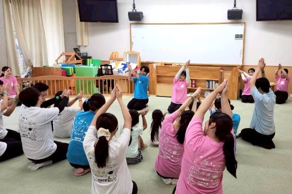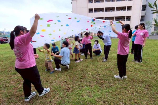学生たちは、「どんぐりマン」に扮してダンスを踊り、手遊び「どんぐりぼうやが探検」を子どもたちと一緒に楽しみ、絵本「どんぐりむらのどんぐりえん」を読み聞かせました。庭園に出て、どんぐり、落ち葉、小枝などを集め、「自分だけのお店」を製作したり、大きなビニールにみんなでカラーセロハンを貼り、「大きな傘」の下から空を見上げたりと、絵本の中の話題に触れ、子どもたちと楽しい時間を過ごしました。最後に、「ジャングル体操」で思い切り体を動かし、学生たちとの別れを惜しむように、いつまでも手を振る子どもたちの姿が印象的でした。