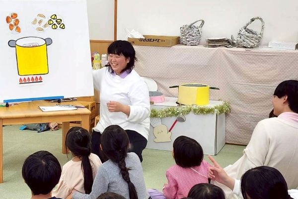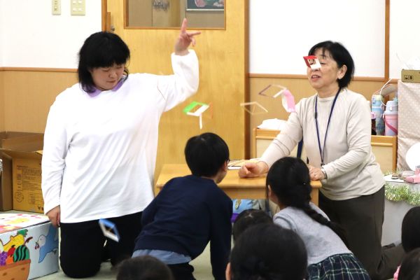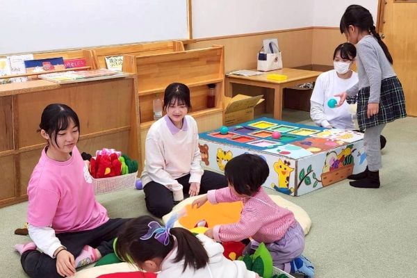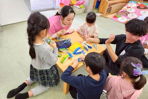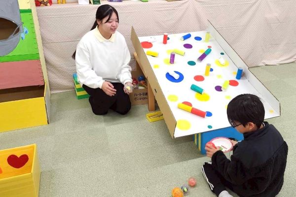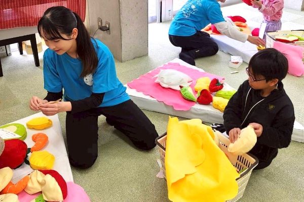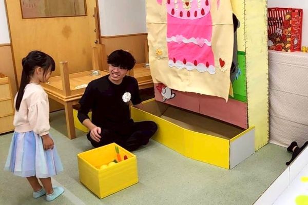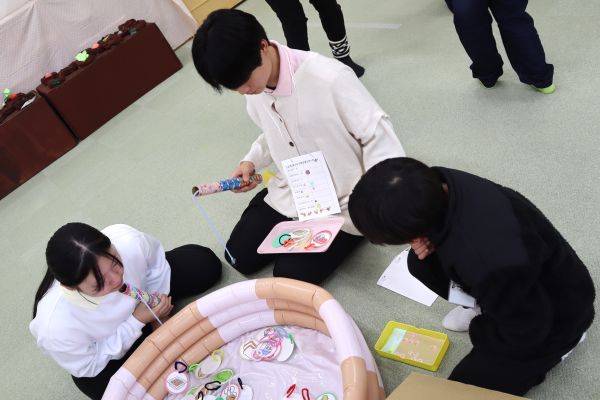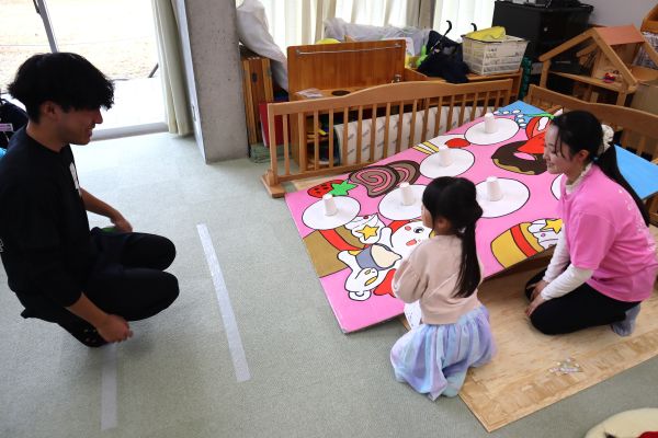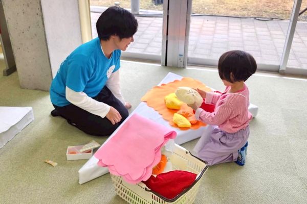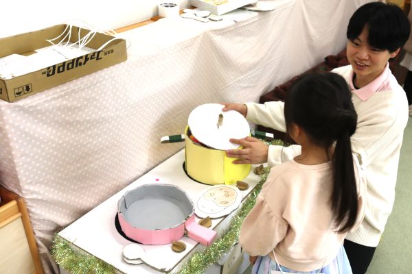 それぞれの「あそび」を「お店屋さん」に見立てたプログラムでは、子どもたちが「お客さん」として元気いっぱい遊んだ後に、「お店屋さん」として「お客さん」を楽しませてくれました。また、パネルシアターや、牛乳パックを活用した工作など、子どもたちを見守り、声掛けをしながら、学生たちも一緒になって楽しみました。