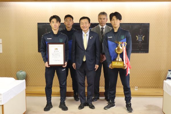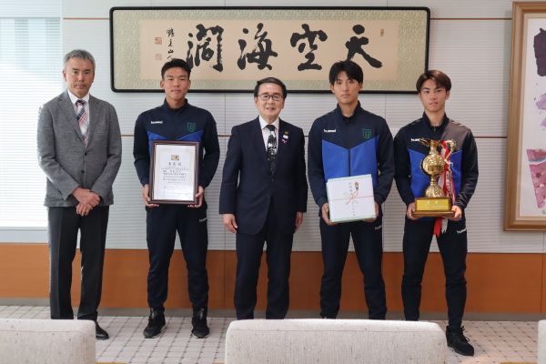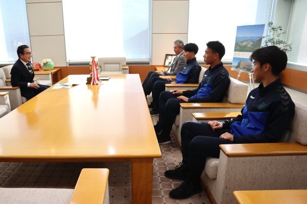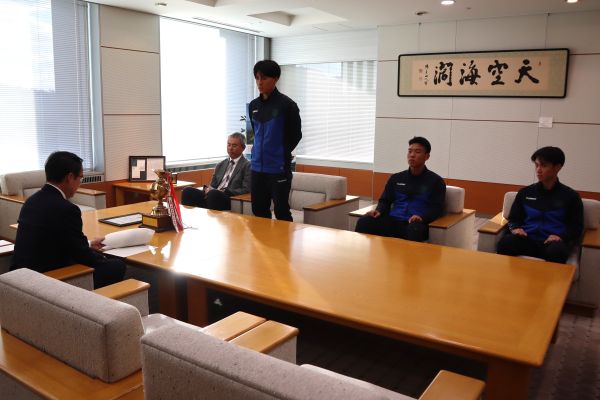 全国大会への出場を報告するため、11月27日(木)に、赤星裕大主将(経営学部4年)、安冨匡祐主務(経営学部4年)、矢野瑛吉選手(経営学部3年)が、大西秀人高松市長を表敬訪問しました。
