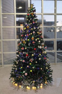 12月1日(月)、本館1階玄関ホール、学生会館1階たーちゃんキッチンと2階らっくんホールにクリスマスツリーを設置しました。