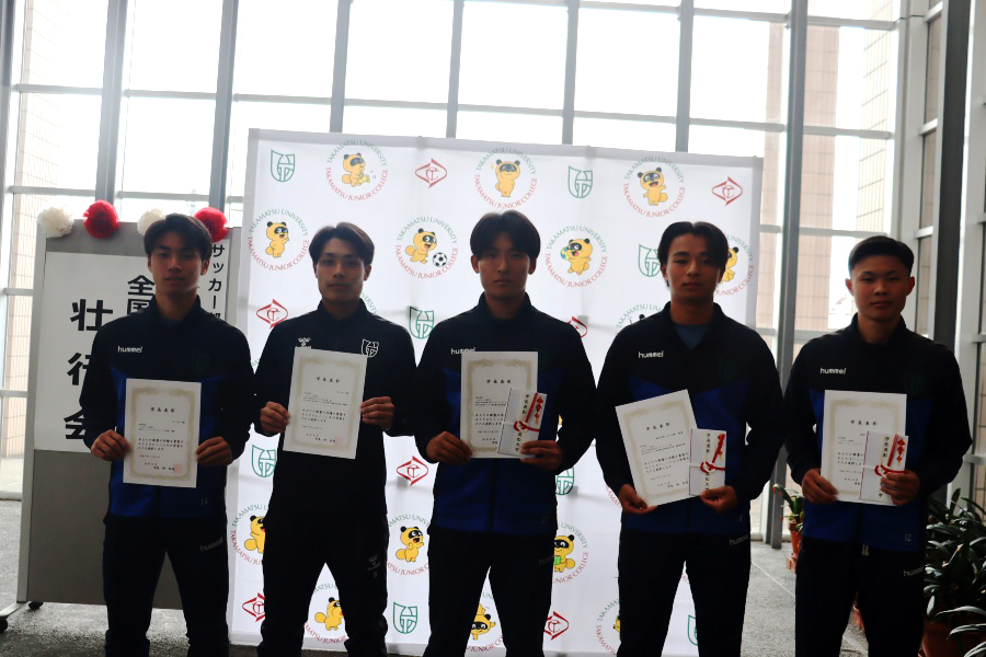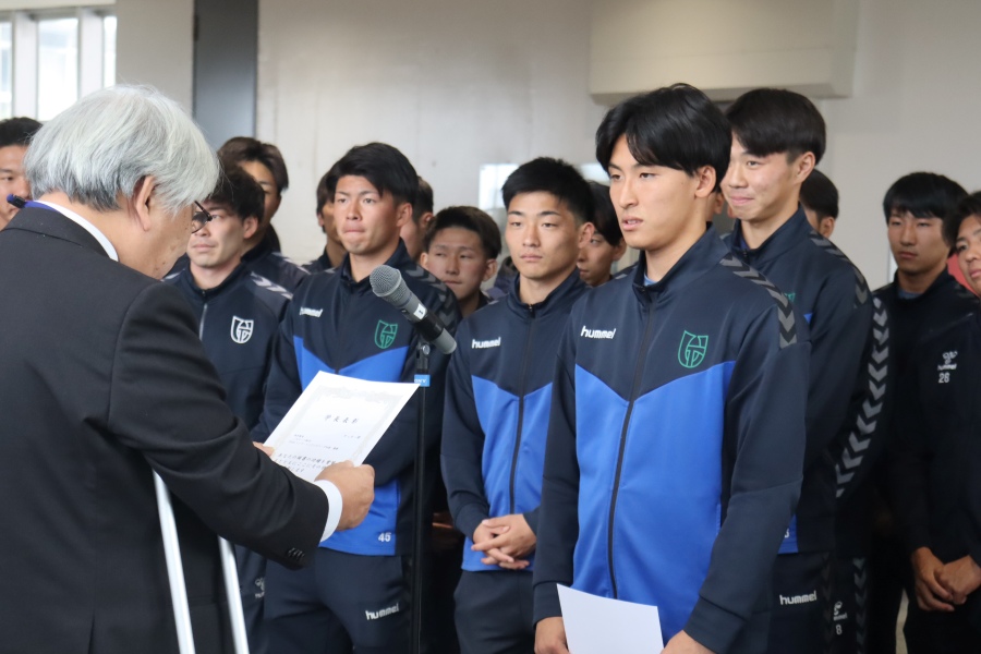 また、壮行会に引き続き、サッカー部の次の業績を称え学長表彰を行い、学長より表彰と副賞が贈られました。