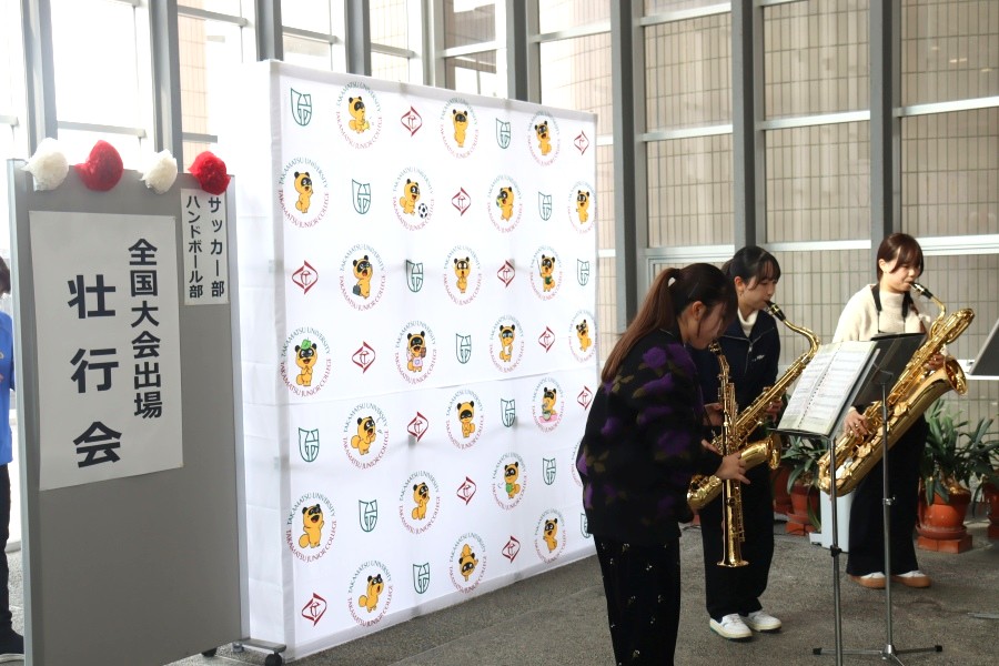 最後は、本学のクラブ「高松アカデミー・ウインドアンサンブル」メンバーによるサクソフォン三重奏の演奏が披露され、全国で戦う仲間たちにエールを送りました。