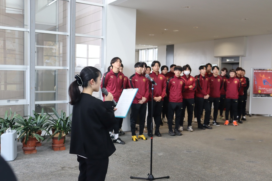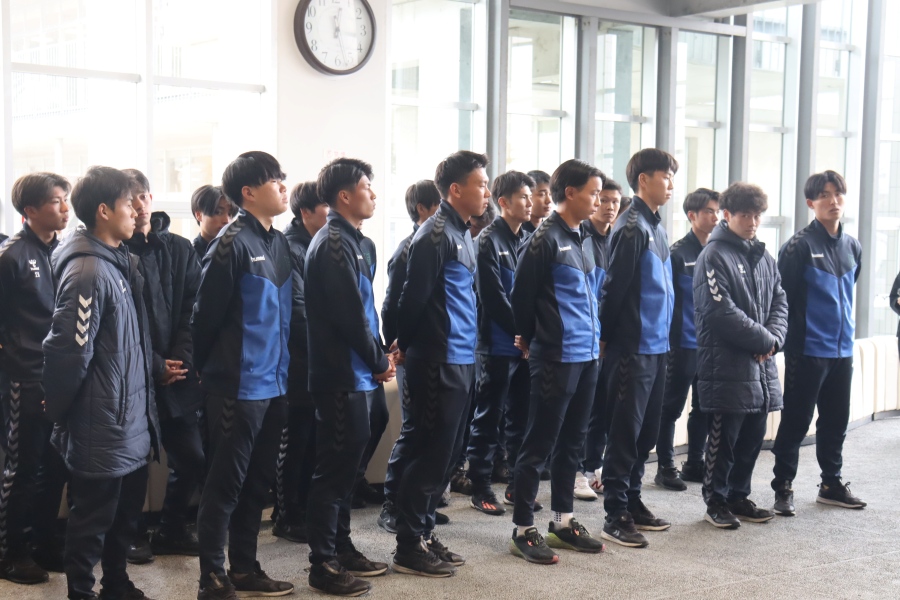 12月2日(火)本館1階ホールにて、今月全国大会に出場するサッカー部及びハンドボール部の壮行会を実施しました。本学を代表して全国の舞台に挑む選手たちの激励に多くの学生や教職員が参加しました。