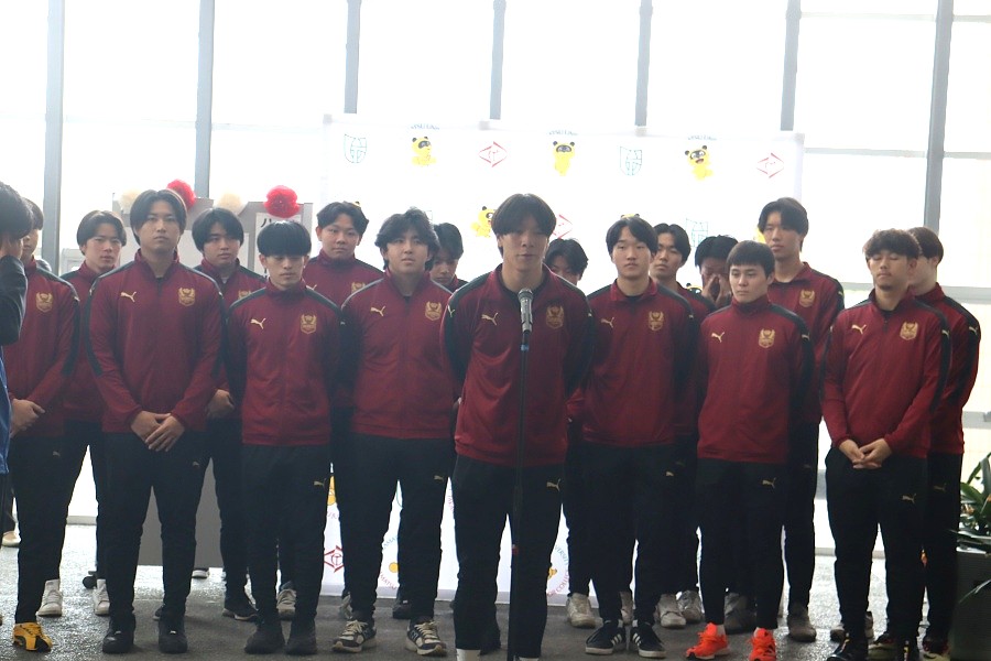 佃学長からの激励の後、選手を代表してサッカー部主将の赤星裕大さん(経営学部4年)、ハンドボール部主将の大田有宇聖さん(経営学部3年)が大会への意気込みを語ってくれました。