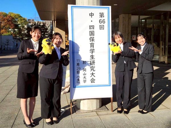 11月29日(土)第66回中・四国保育学生研究大会が岡山県で開催されました。この大会は、中・四国の保育者をめざす学生たちが一堂に会し、研究発表や創作劇などを通して、将来の保育者としての実践力や専門性を深める貴重な学びの場として、毎年開催されています。今年度も、発達科学部および保育学科の学生が参加しました。