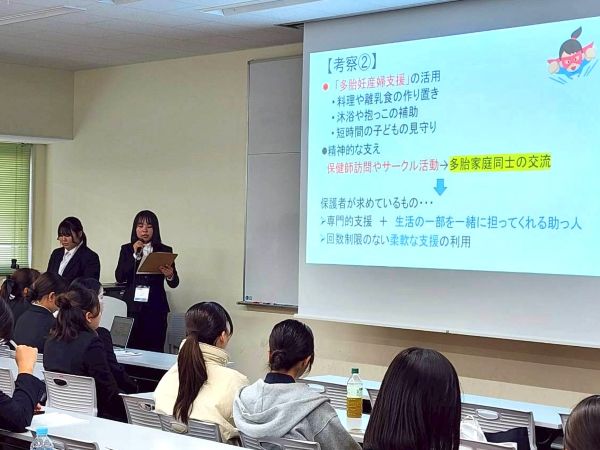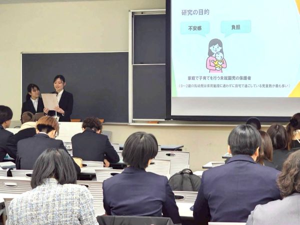 発達科学部からは、4年生4名が本学代表として研究発表を行いました。発表された研究テーマは、「高松市地域子育て支援拠点事業の充実に向けた課題」、「多胎育児の困難さとその支援について」の2本です。どちらも、子育て支援に関わる重要な課題を取り上げた内容であり、地域の実態に基づいた調査と考察に、聴講者からも高い関心が寄せられました。発表前は緊張の様子も見られましたが、これまでの学修成果を堂々と発表する姿からは、保育者をめざす学生たちの成長と意欲が感じられました。