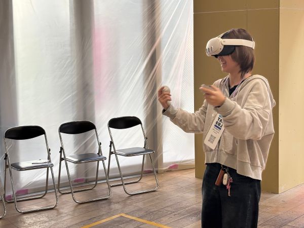 VR体験では、1ラウンド90秒間のe-スポーツを体験していただきました。まるで実際のリングにいるかのような臨場感を味わうことができます。学生たちは、VRゴーグルやコントローラー等の道具の準備や操作説明はもちろんのこと、安全面に配慮しながら、体験中の声掛け等を行いました。