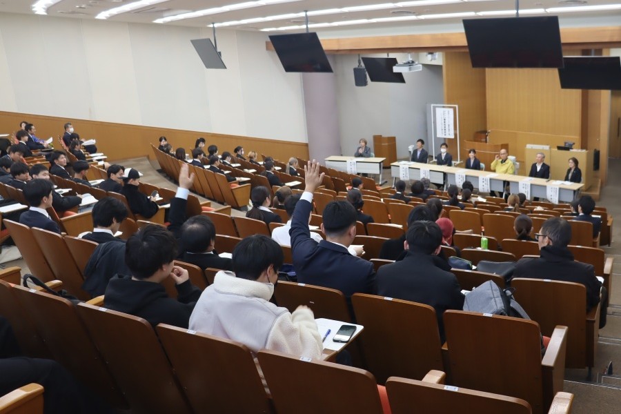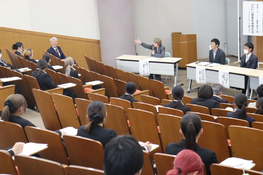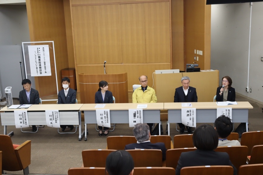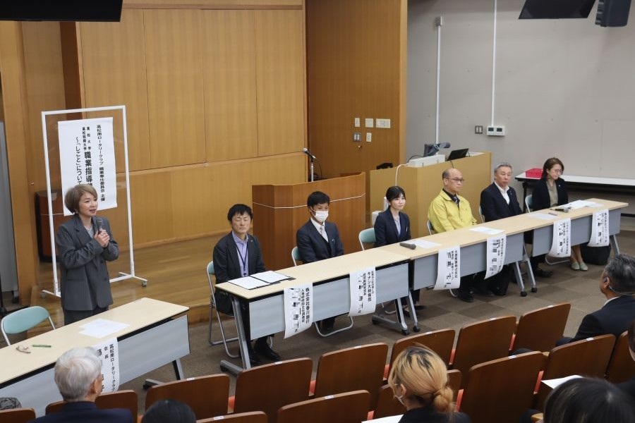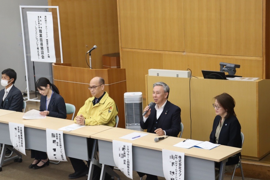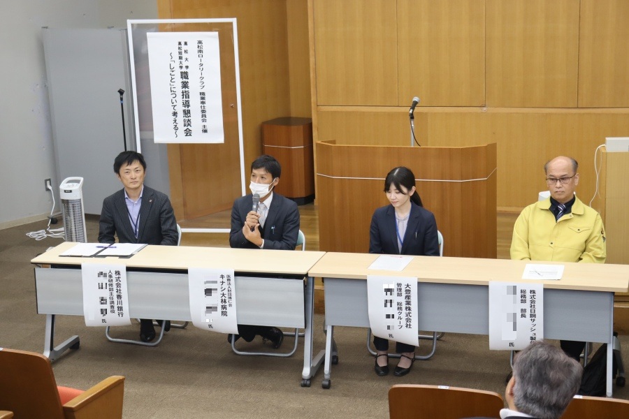 12月5日(金)就職ガイダンスの一環として、高松南ロータリークラブの協力のもと「職業指導懇談会」が開催されました。この会は、1995年から今年まで一度も欠かすことなく毎年開催され、今回で31年目となりました。高松南ロータリークラブ様のお声がけでお集まりいただいた6事業所の人事担当者の皆様が、採用したい学生像、新入社員に求める資質などをテーマにパネルディスカッション形式で、「社会に出るということはどういうことか?仕事とは?」を学生にご教示くださいました。学生は企業等の生の声に熱心に耳を傾け、これから本格的に始まる就職活動に向けて、より意欲を高めました。