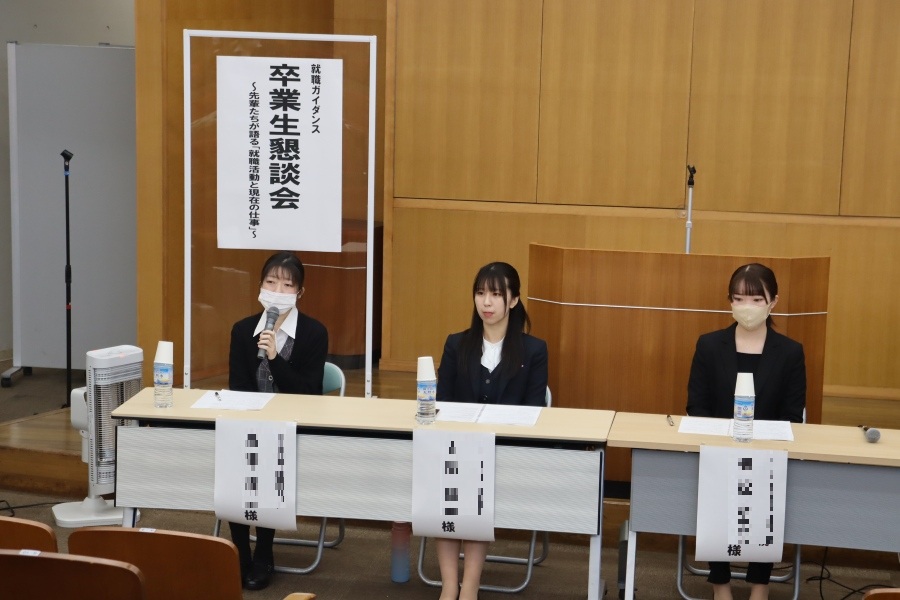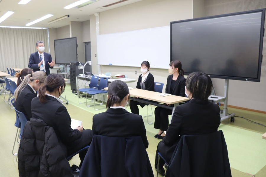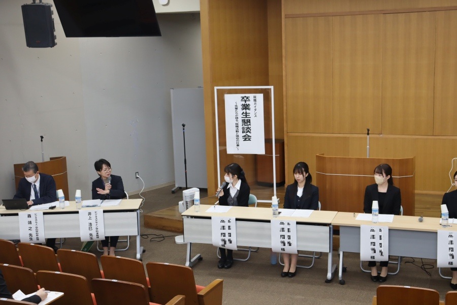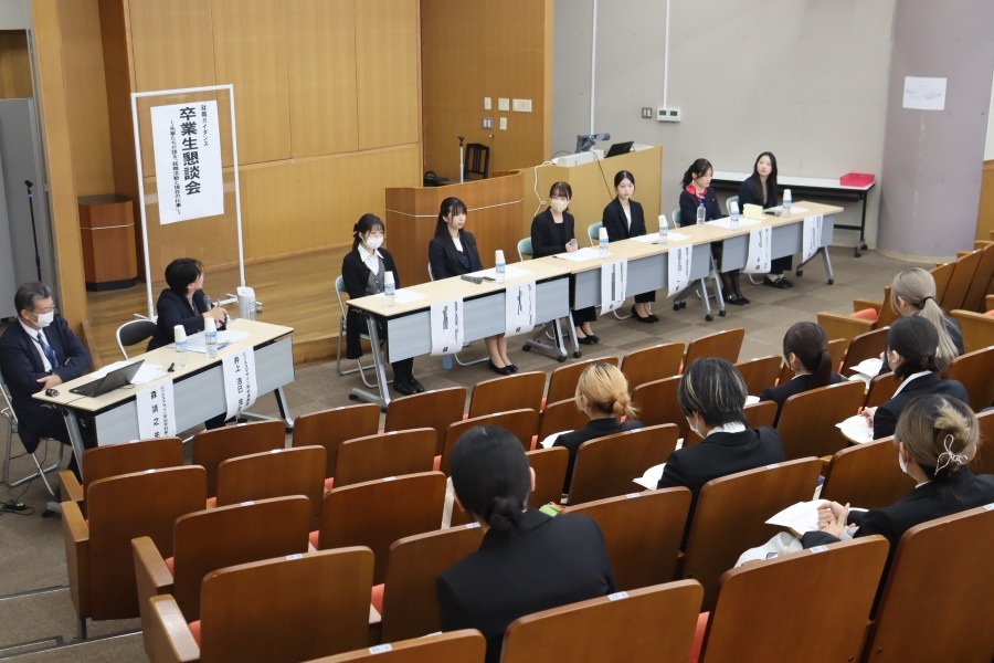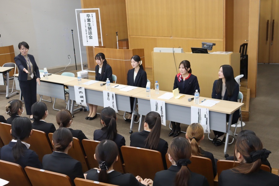 12月7日(日)就職ガイダンスの一環として、各分野で活躍されている秘書科(現ビジネスデザイン学科)の卒業生6名を招き、卒業生懇談会を実施しました。卒業生からは、現在の仕事や学生時代の就職活動における体験談を後輩に向けて熱心にお話いただきました。在学生も就職活動の悩みなどを積極的に質問し、今後の就職活動に活かそうと懸命に取り組んでいました。