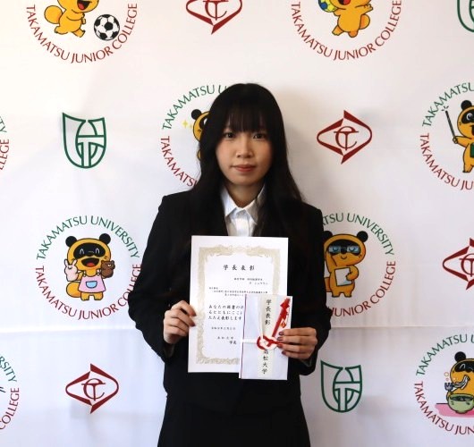 本学では、学術・文化・スポーツ等の各部門において、顕著な成果があったと認められた者又は団体に対し、学長表彰を行っています。次のとおり、経営学部 特別聴講生 ヨ シュウリン さん ビジネスデザイン学科 2年 横井 那海 さんの功績を称え学長より表彰状と副賞が贈られました。