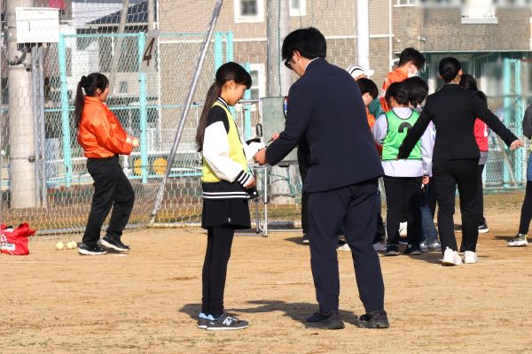 当日は、第1部・第2部あわせて約170人の子どもたちが県内各所から本学グラウンドに集まりました。「早寝・早起き・朝ごはん&あいさつ運動」啓発キャンペーンのキャラクター「カイケツ朝ごはん」と一緒に準備運動をした後、いよいよ鬼ごっこのスタートです。子どもたちは鬼に捕まらないように必死で逃げながら6つのミッションに挑み、ポイントの高さで優勝を狙います。ハンター役の学生や香川オリーブガイナーズの選手の皆さんから上手く逃げて周回を重ね、1部、2部それぞれで4人の子どもたちが受賞しました。