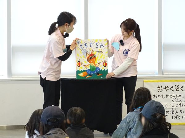 今回の「おはなし会&マイ絵本づくりワークショップ」では、絵本の読み聞かせや手遊びなどを中心にした「おはなし会」と、自分オリジナルの「マイ絵本」が作れるワークショップで子どもたちと交流しました。